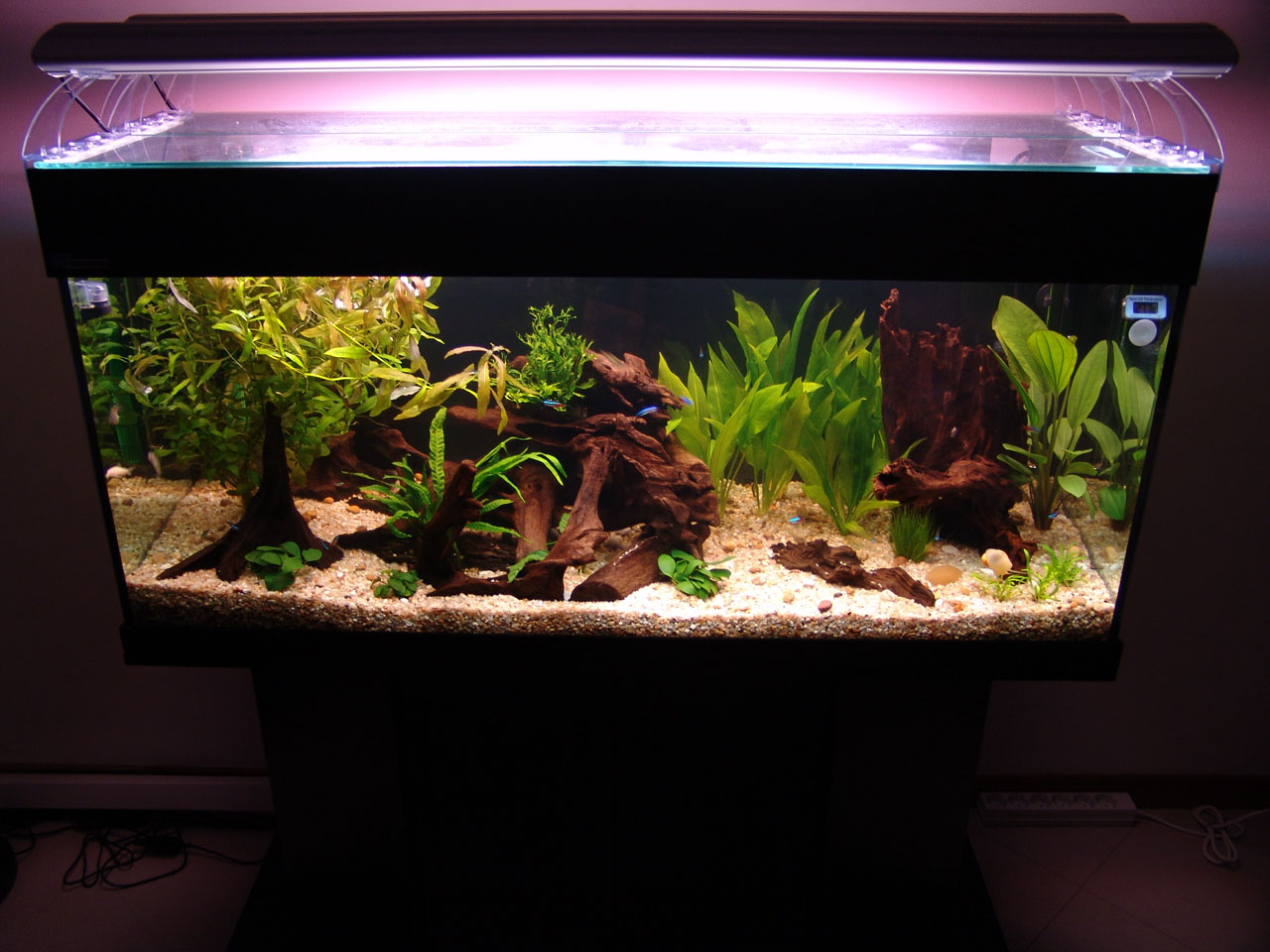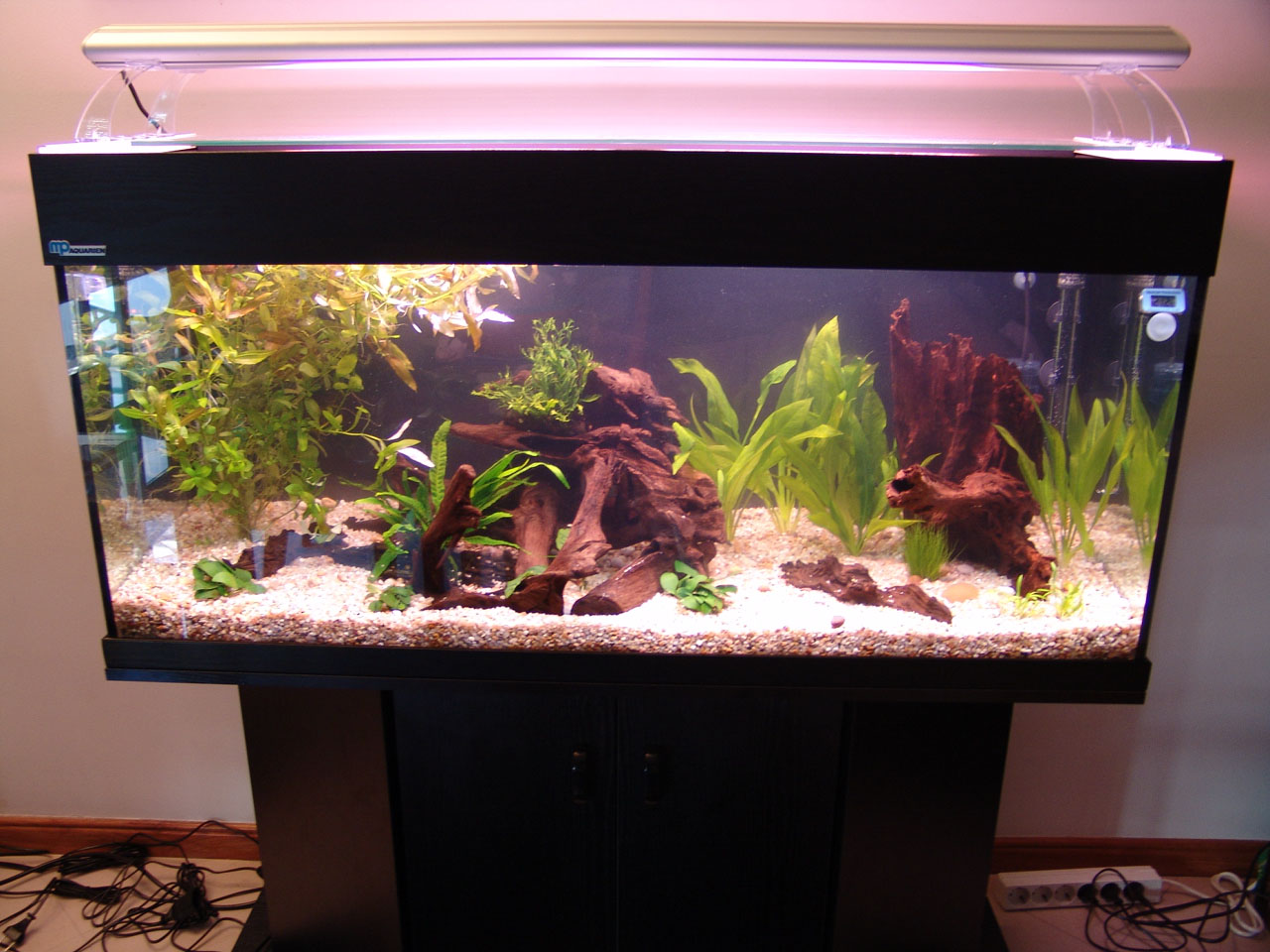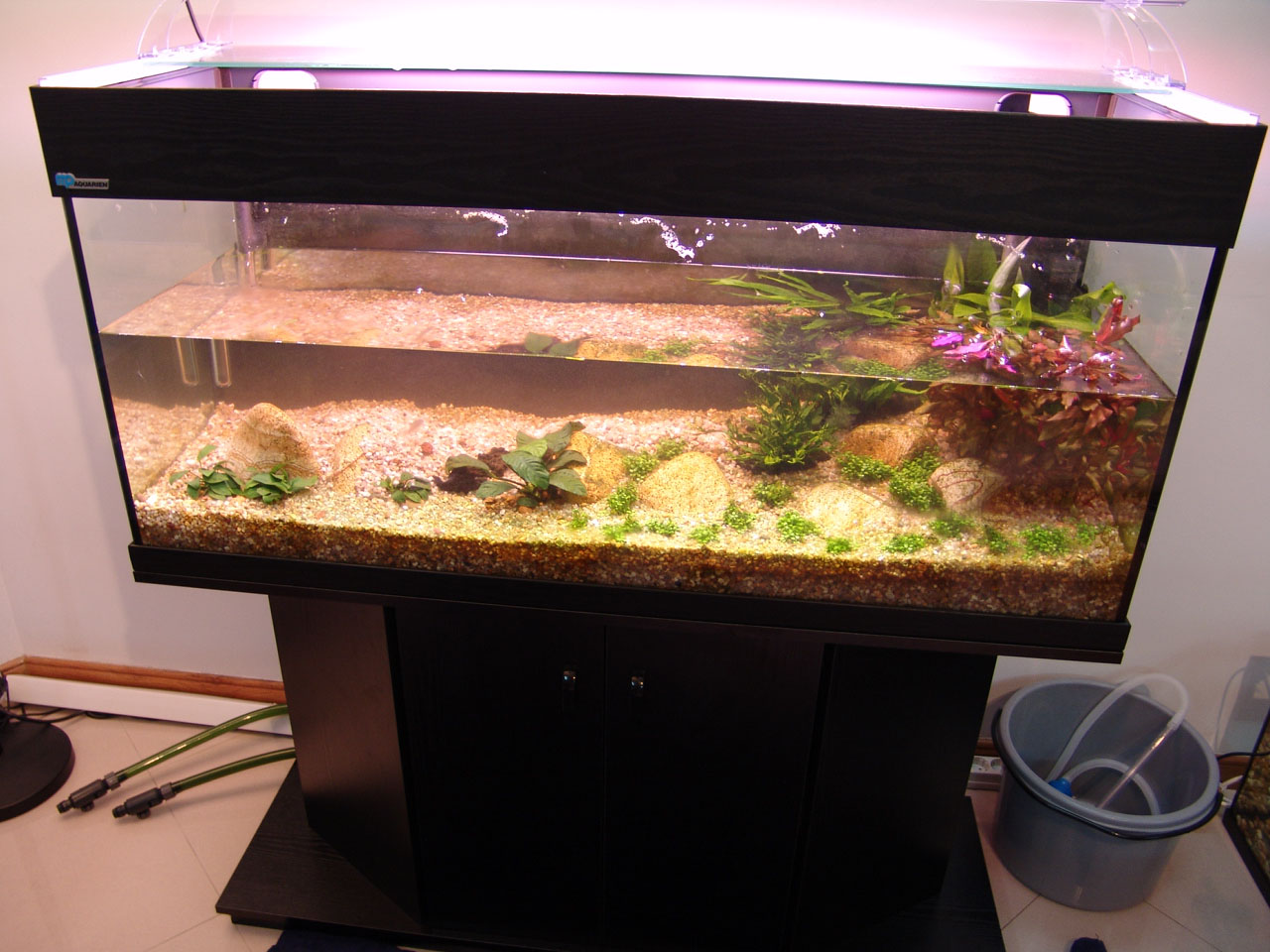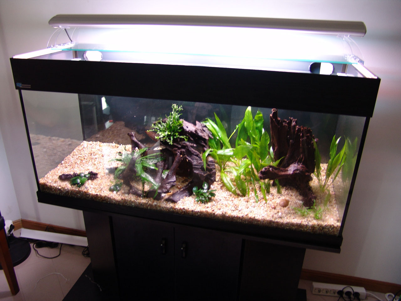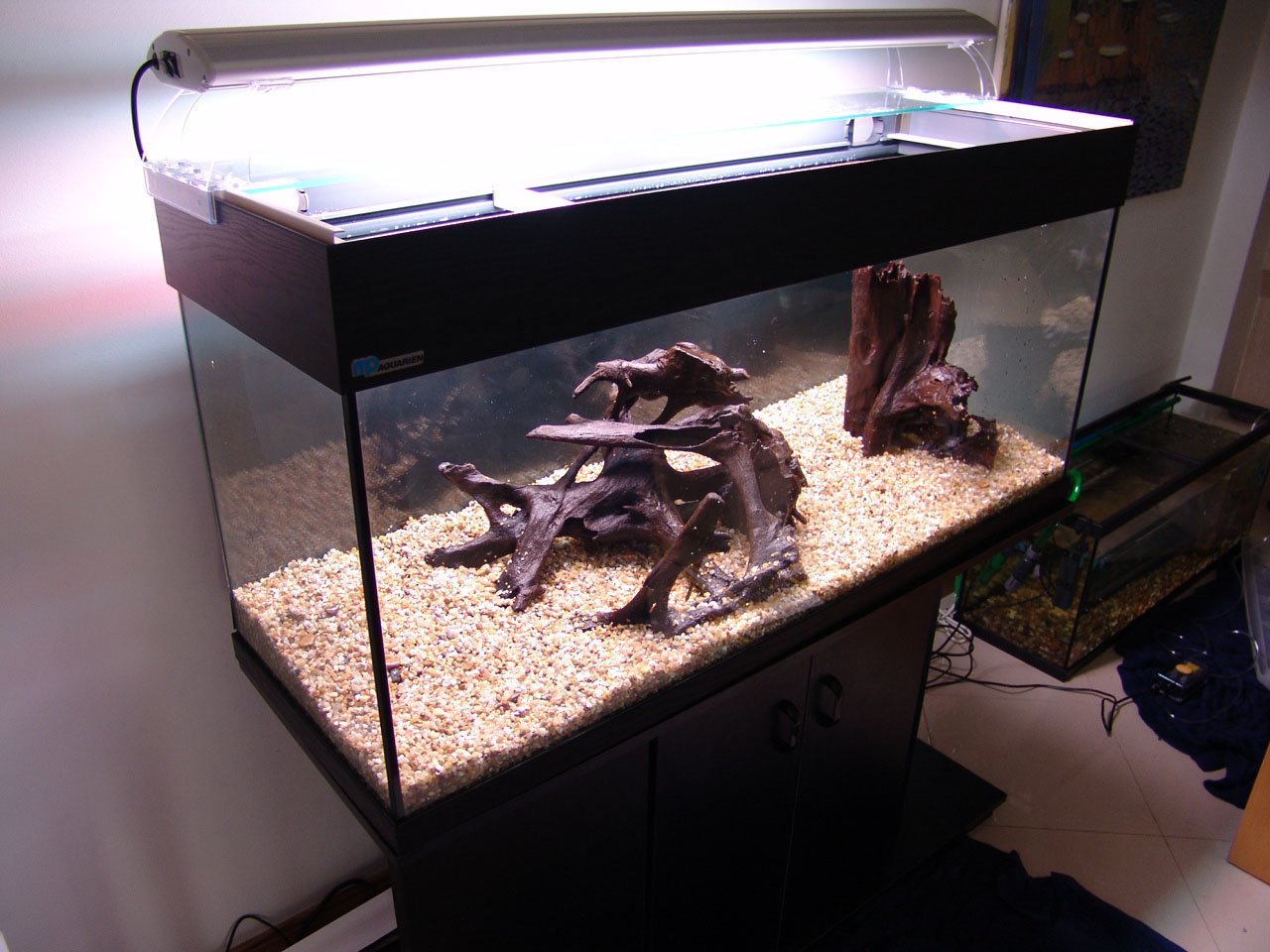 Gravel and driftwood was added. Heating and filtration were ready.