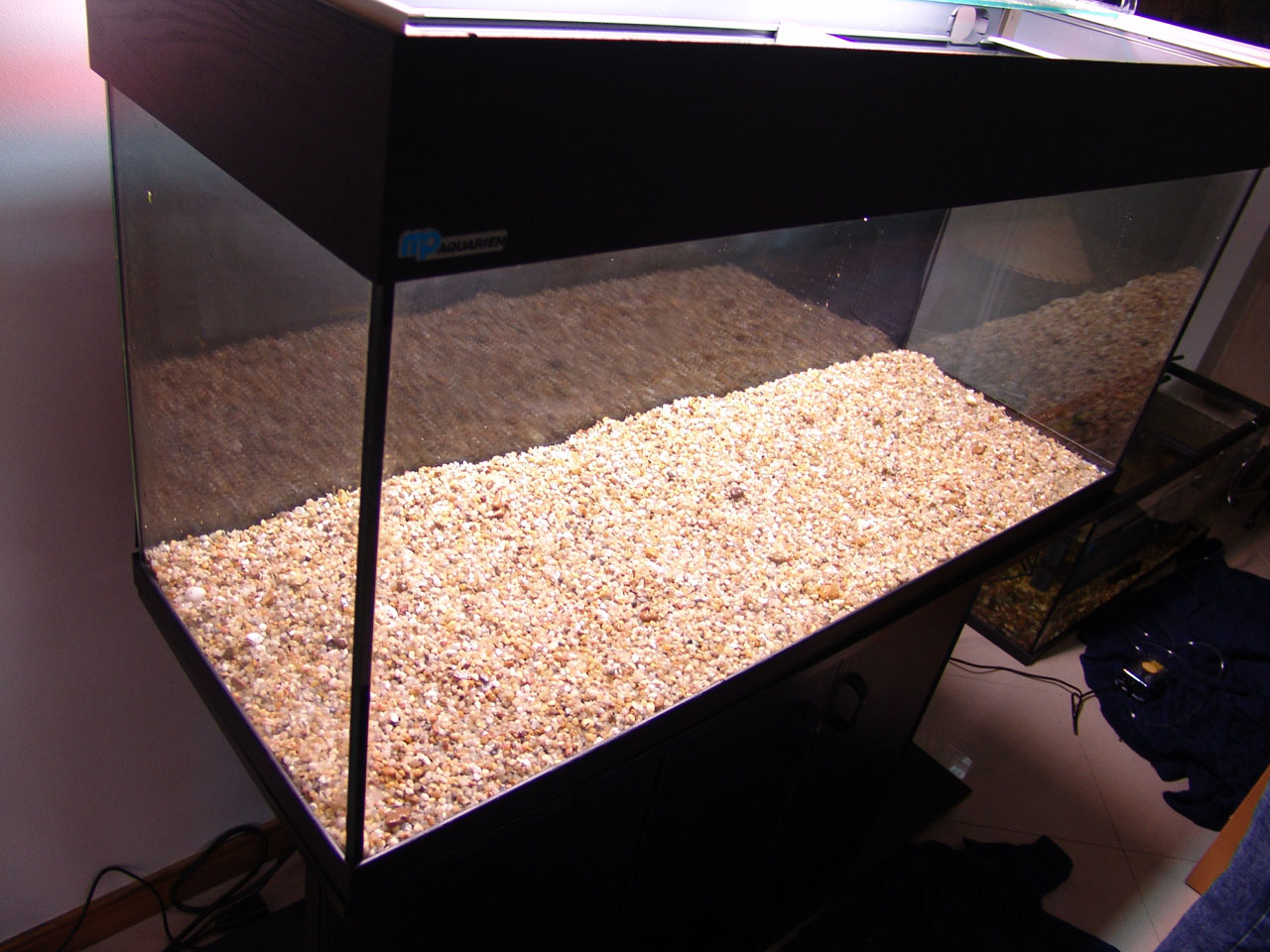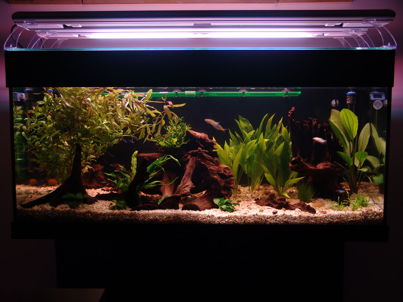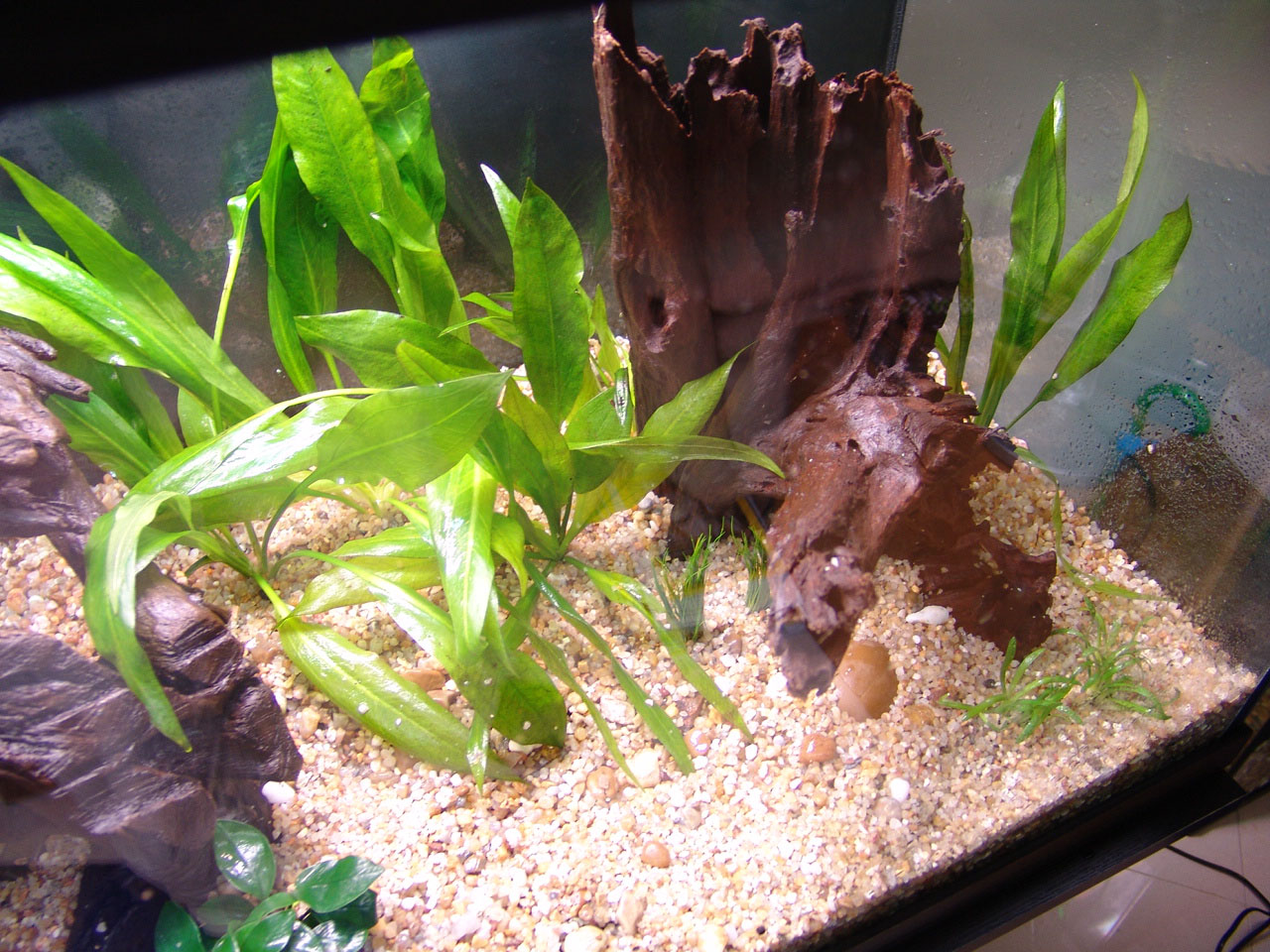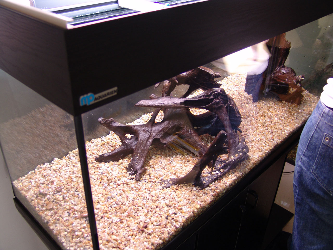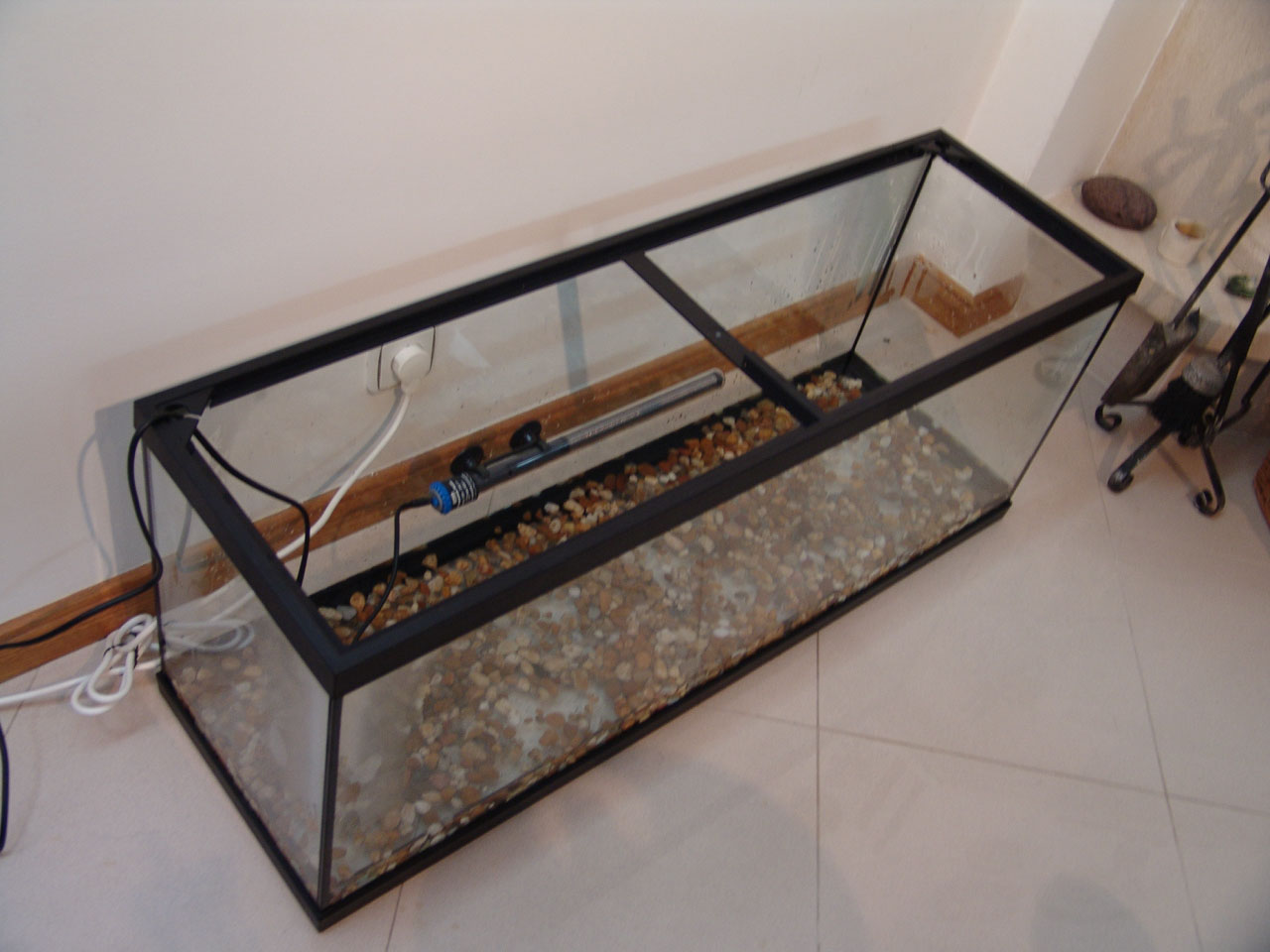 Gravel and driftwood was added. Heating and filtration were ready.