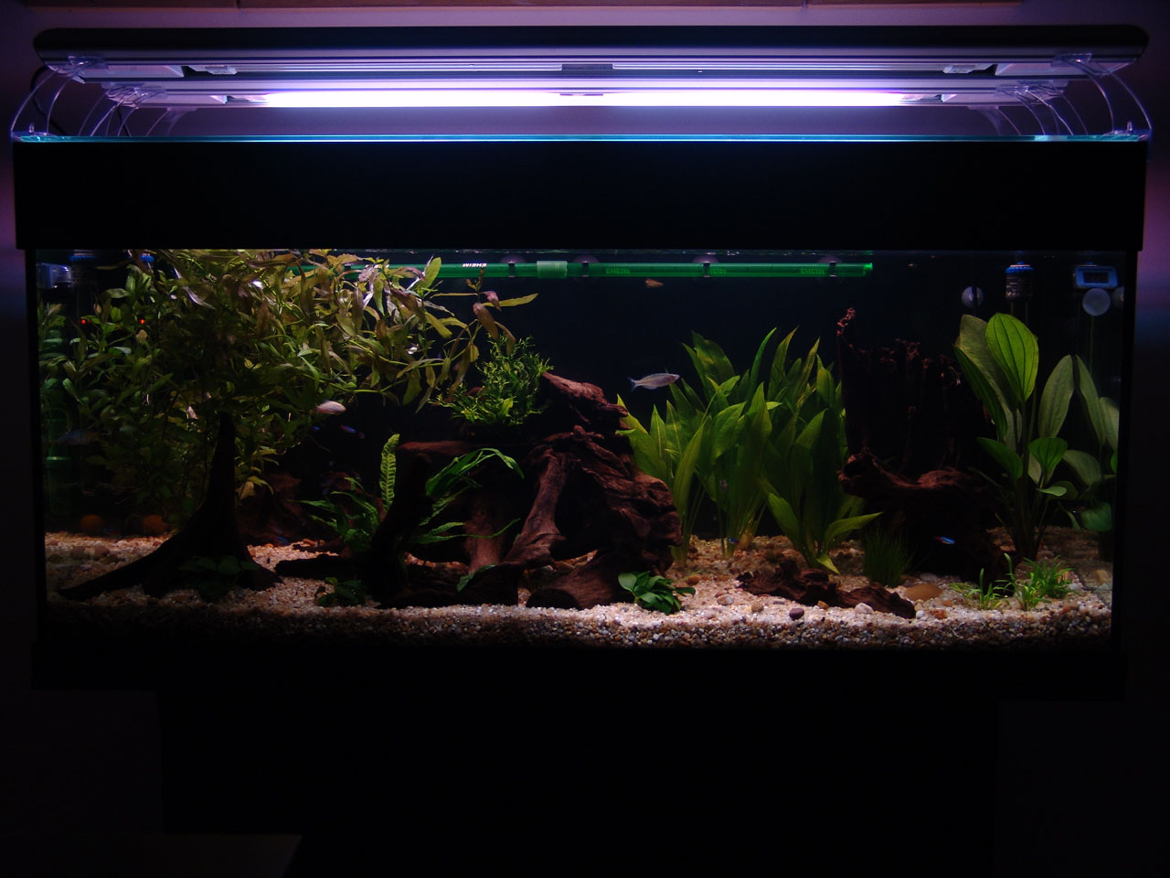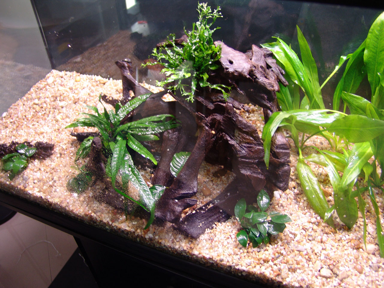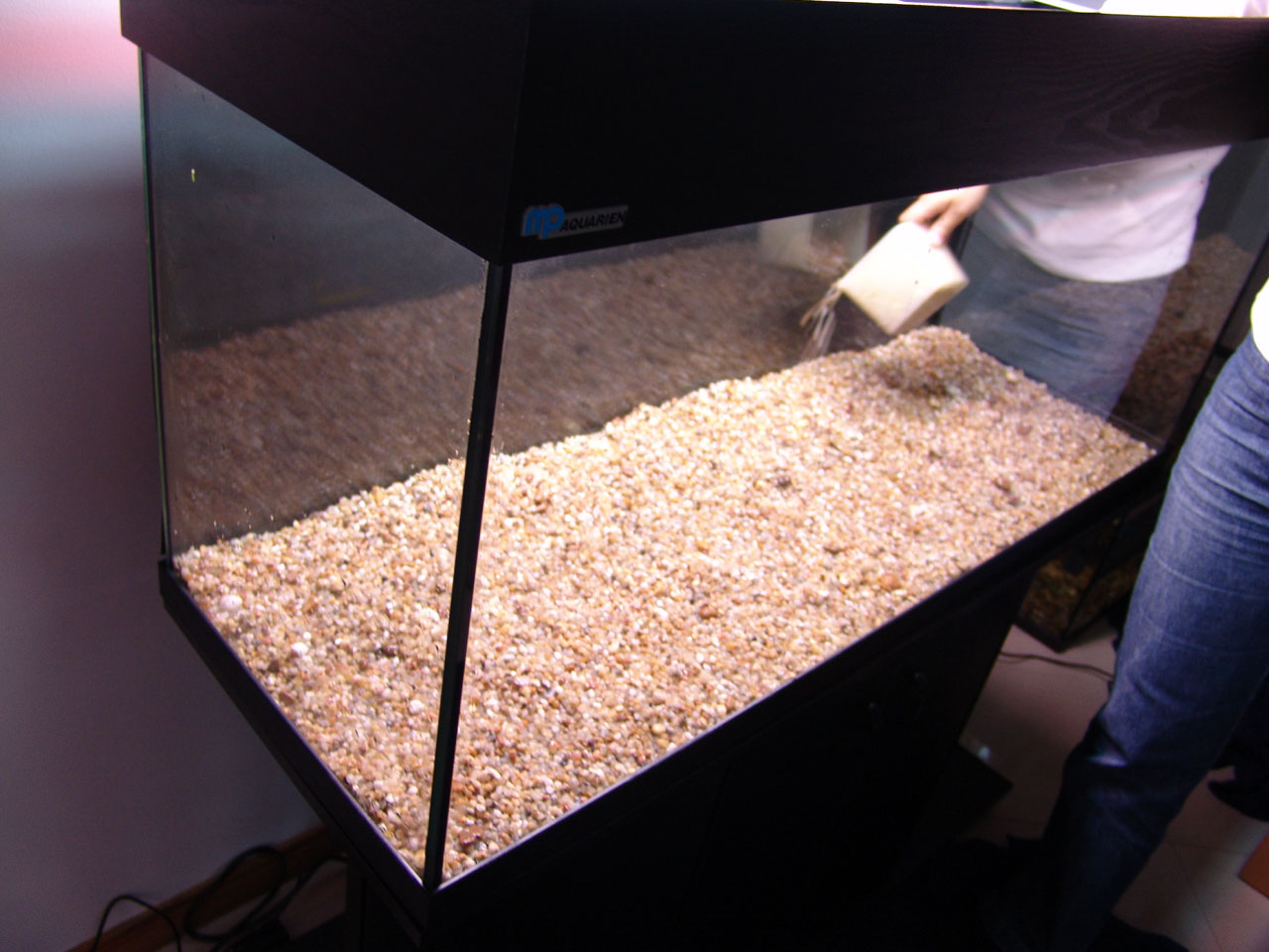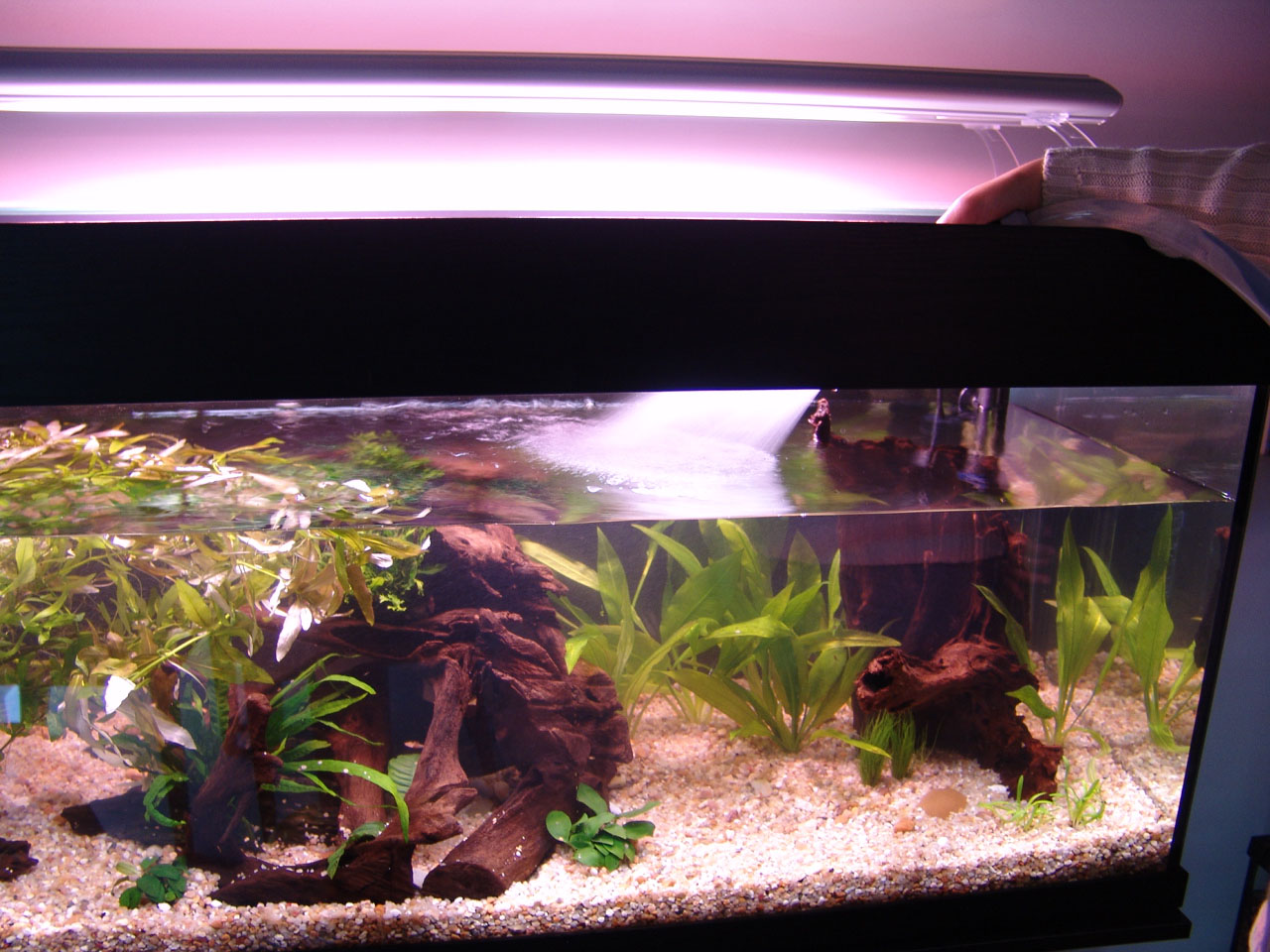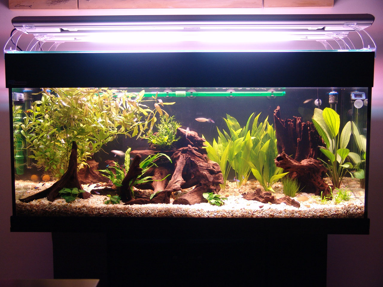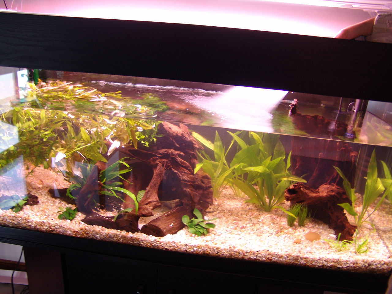 Gravel and driftwood was added. Heating and filtration were ready.