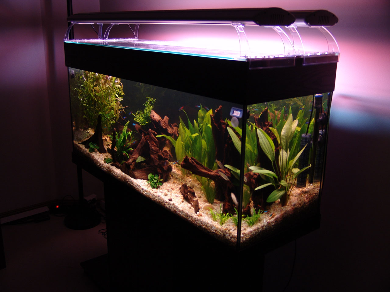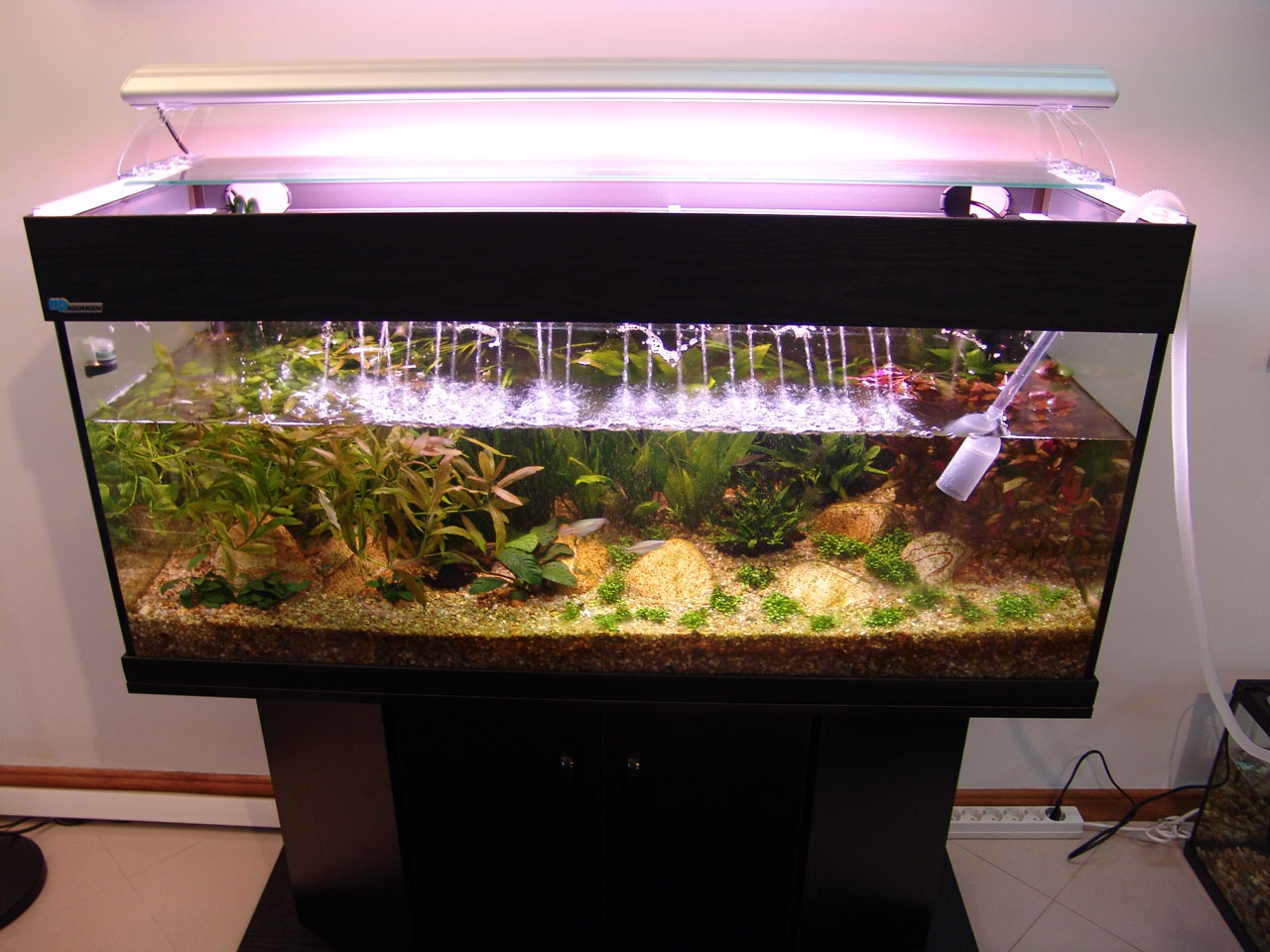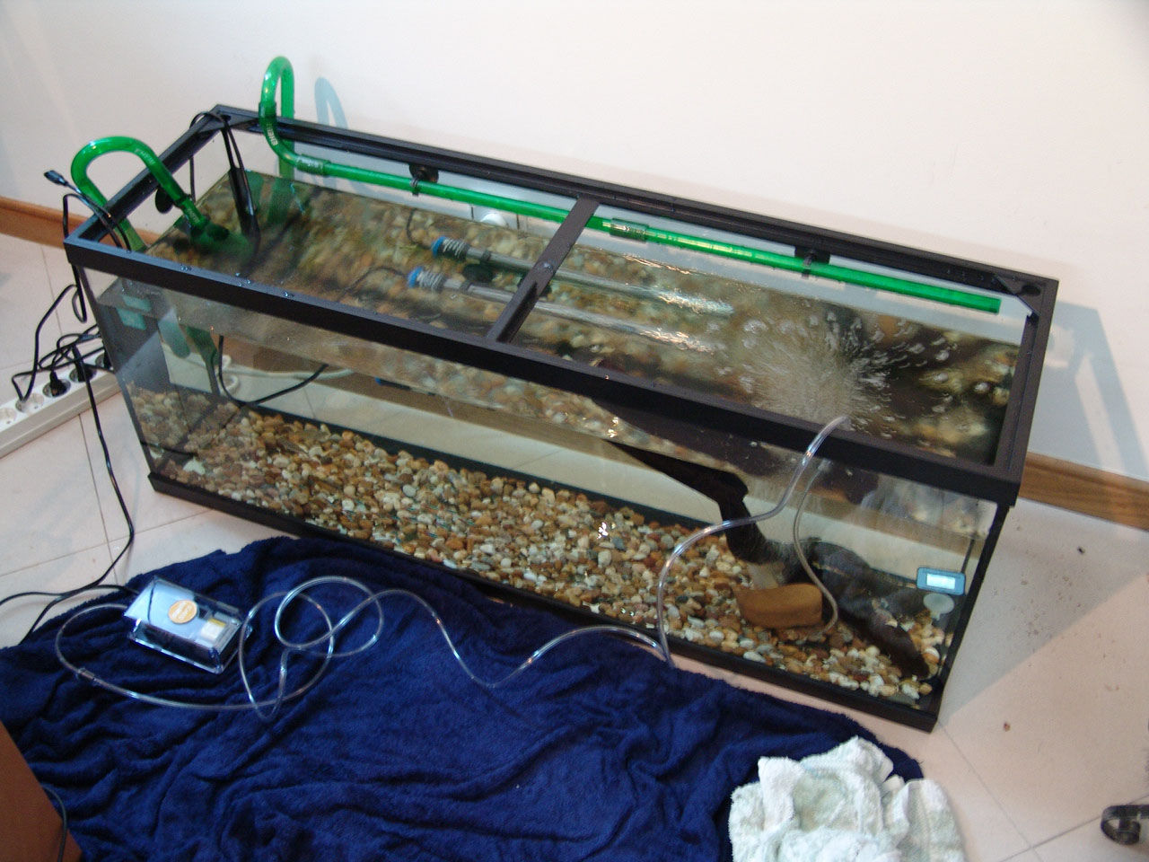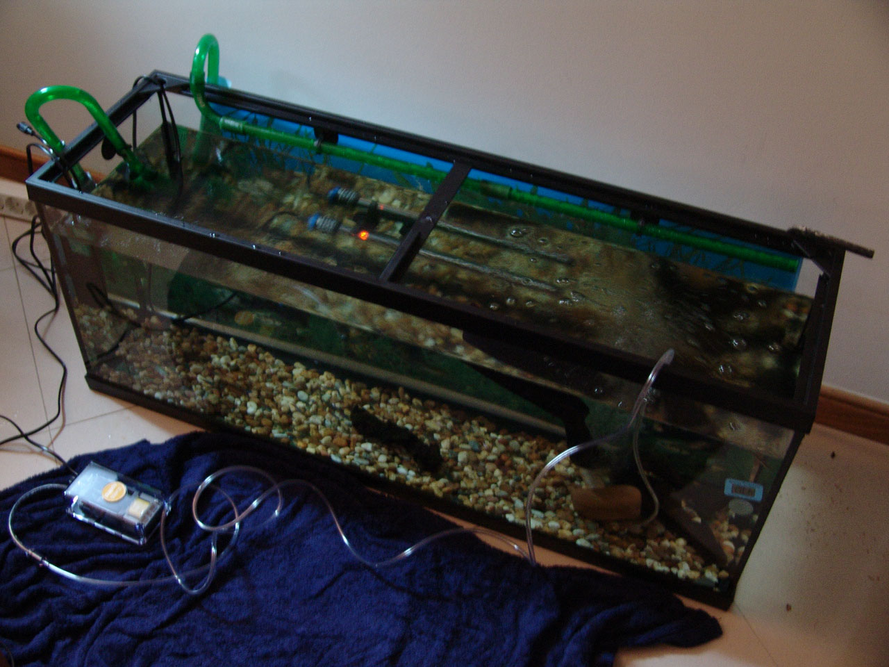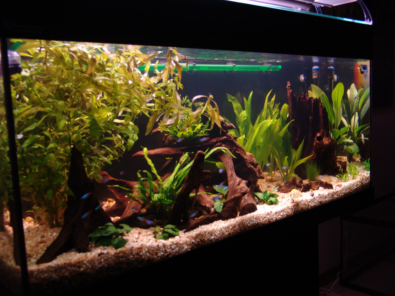 Gravel and driftwood was added. Heating and filtration were ready.