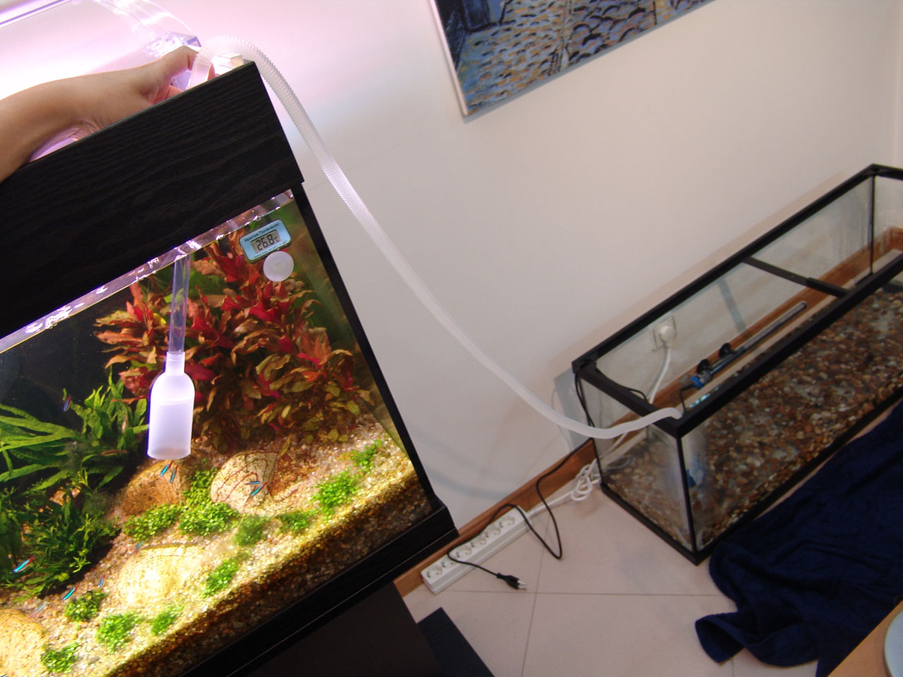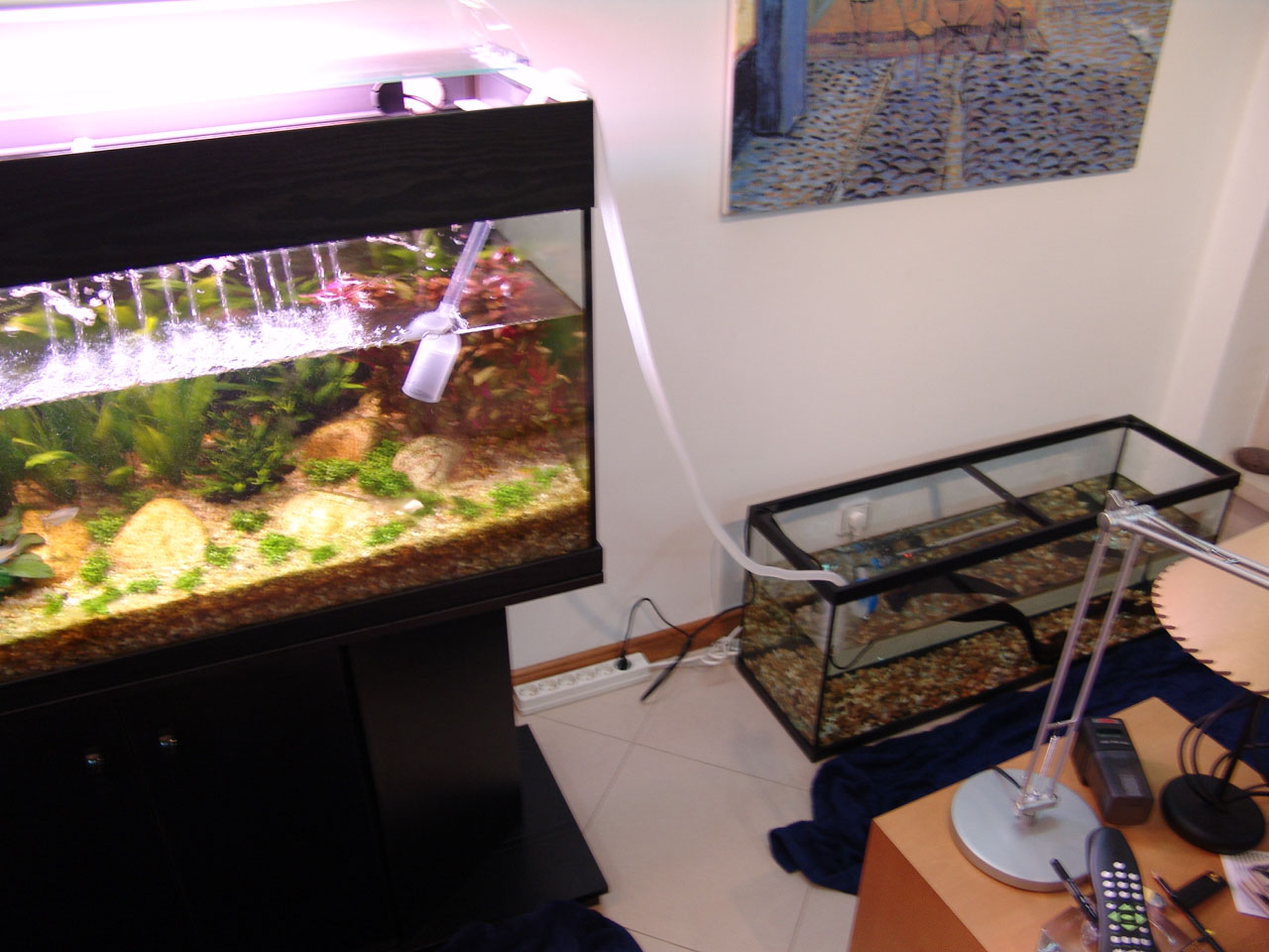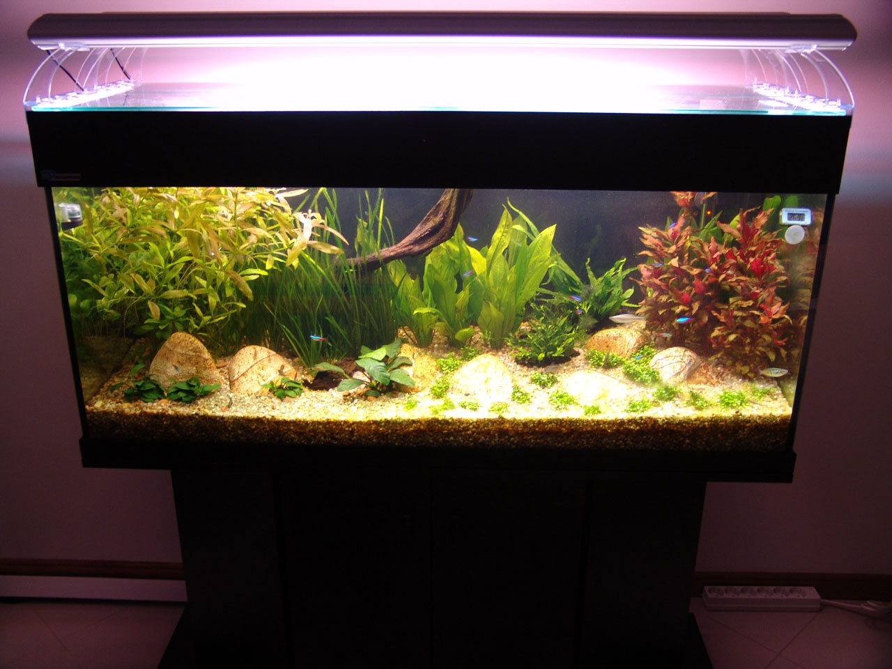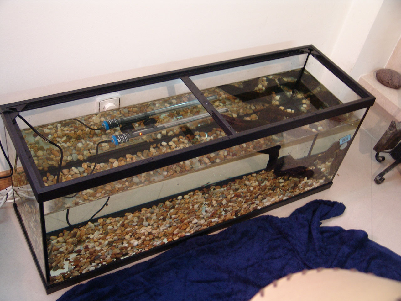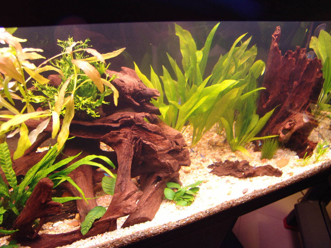 Gravel and driftwood was added. Heating and filtration were ready.