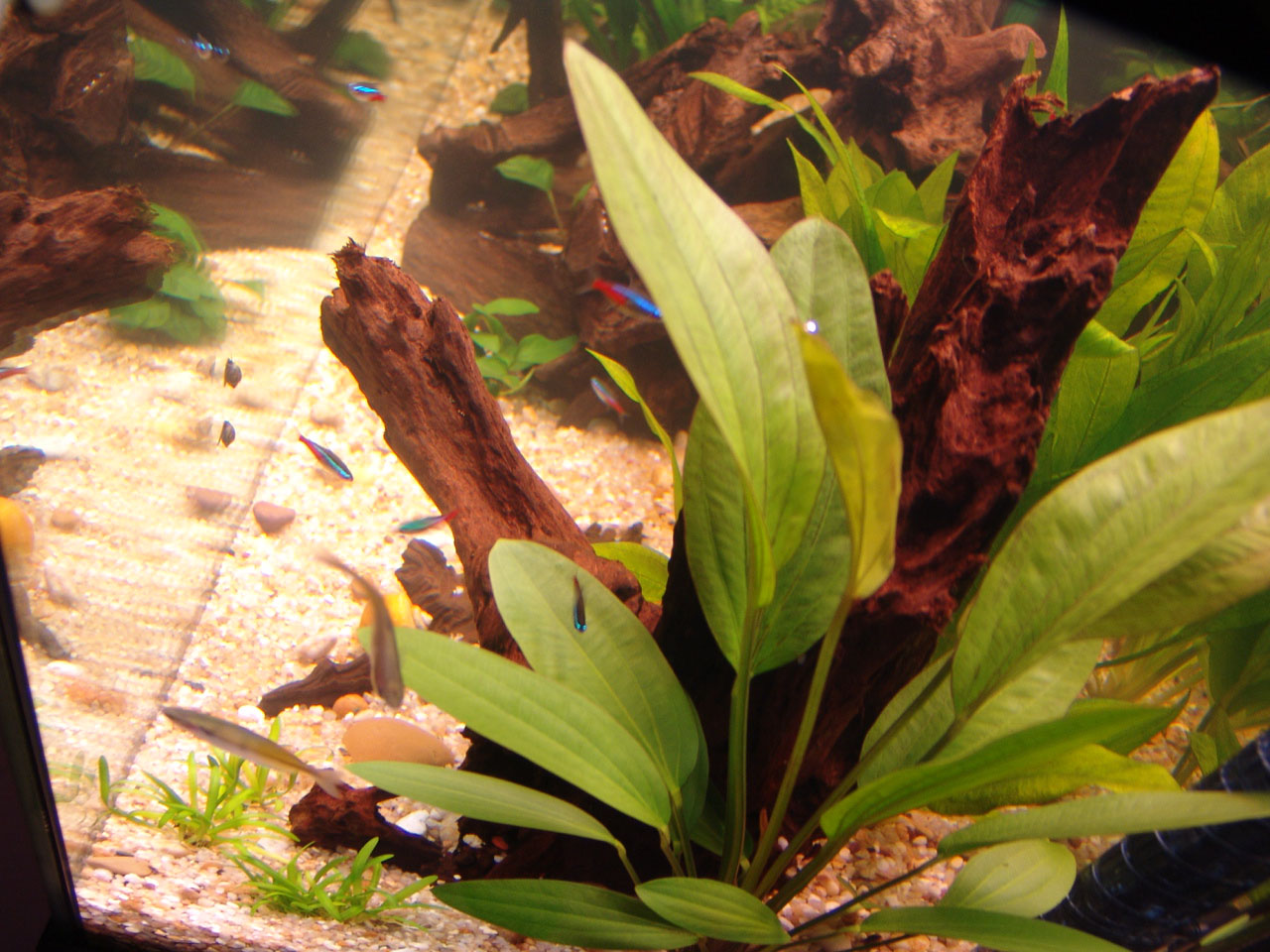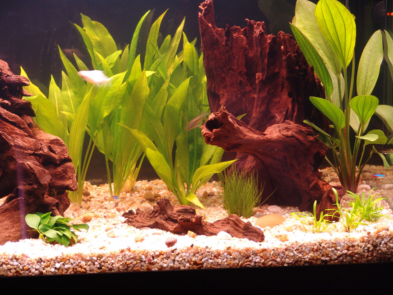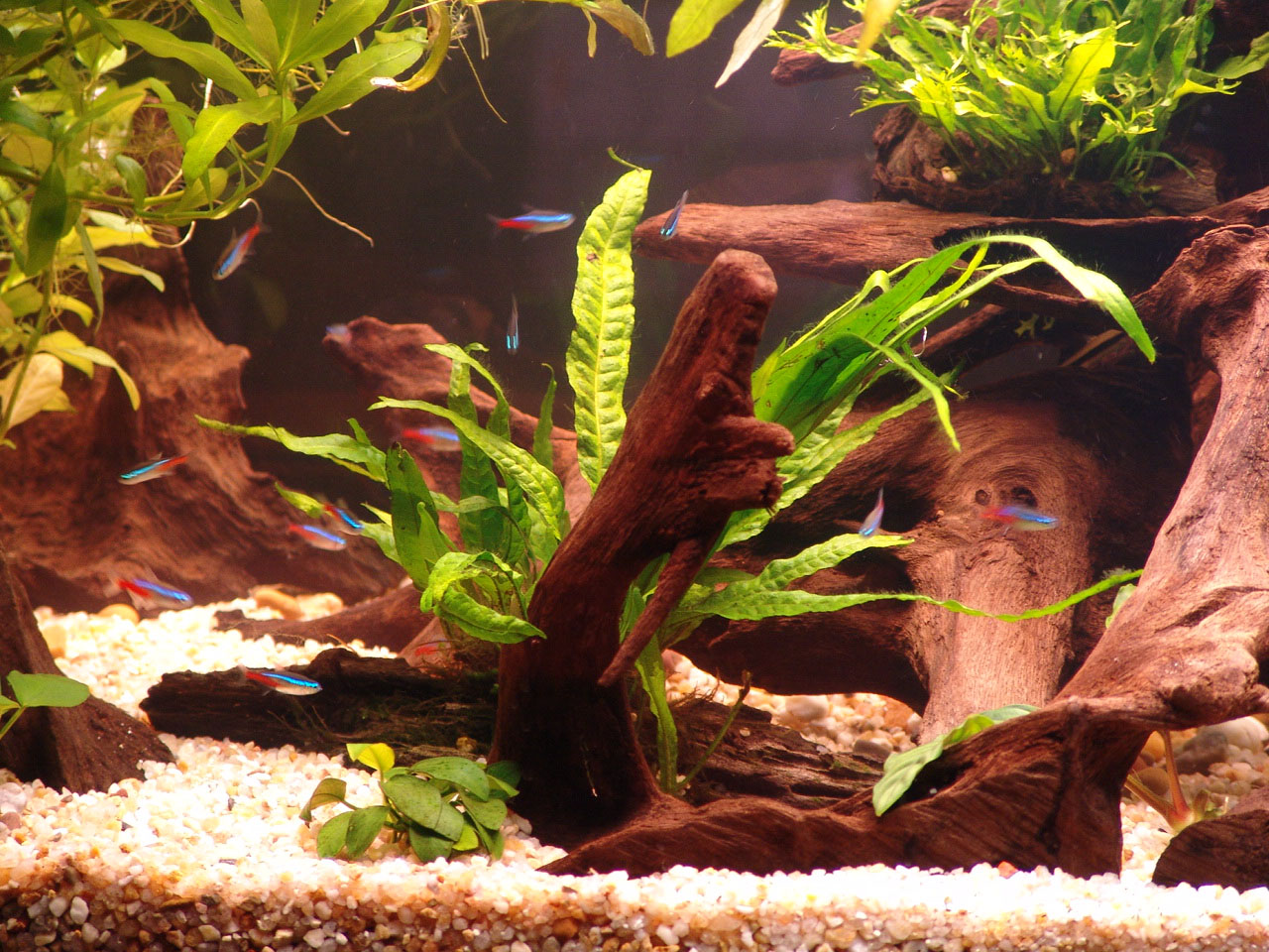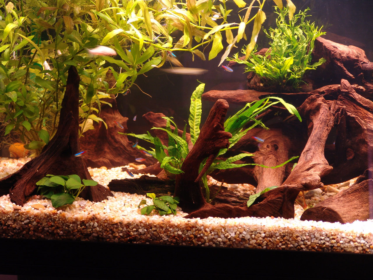 Plants were distributed over the gravel and on the driftwood