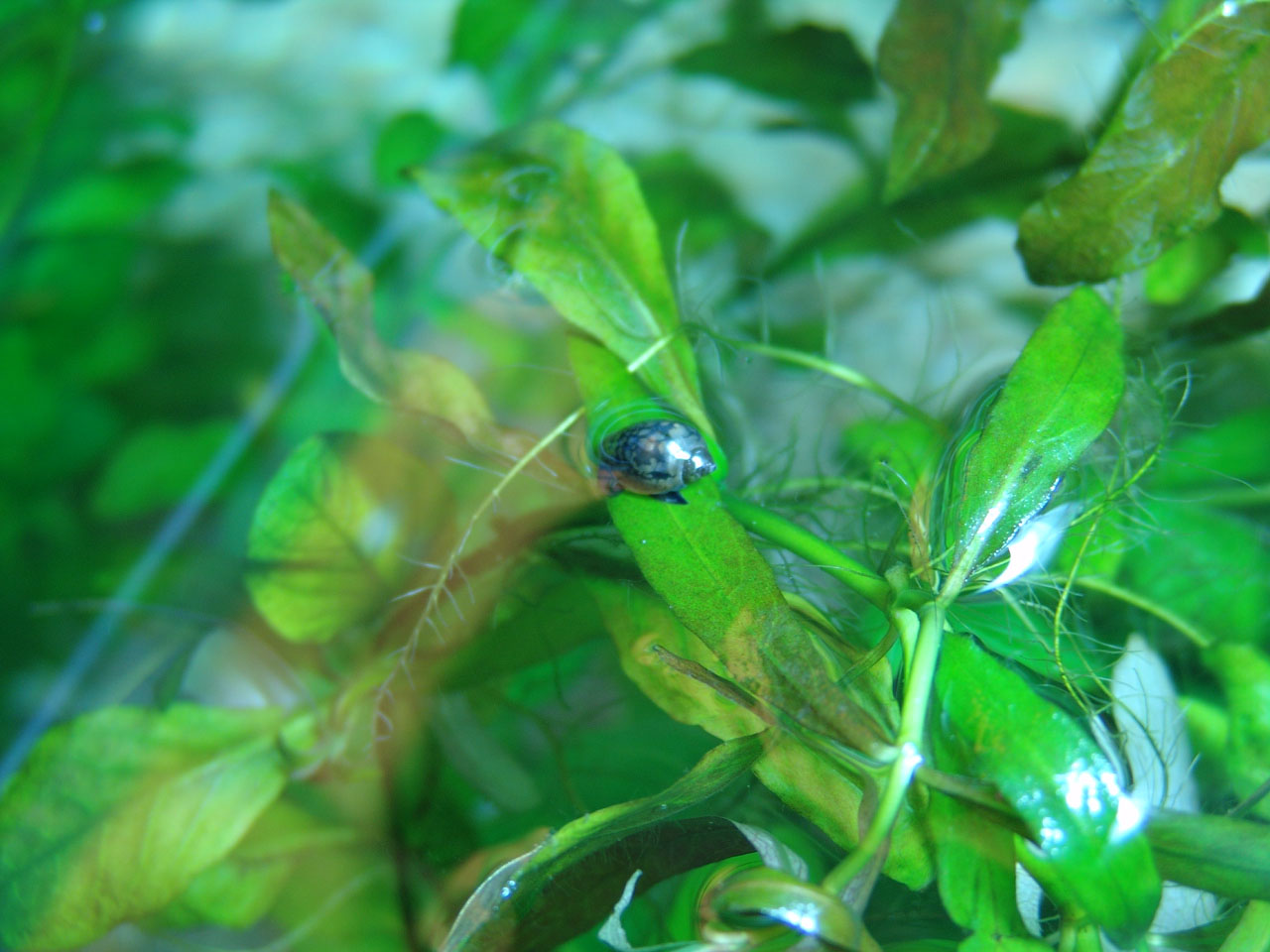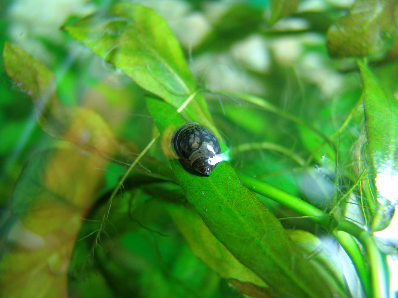 Physa Spec on top, on the leaves of Hygrophila Polysperma