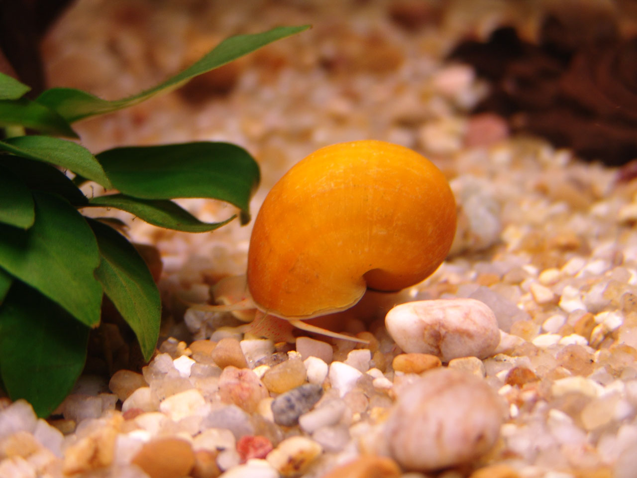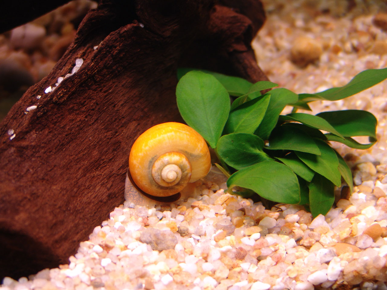 Macro on snails, Pomace Bridgesii bellow, on the gravel, near Anubias