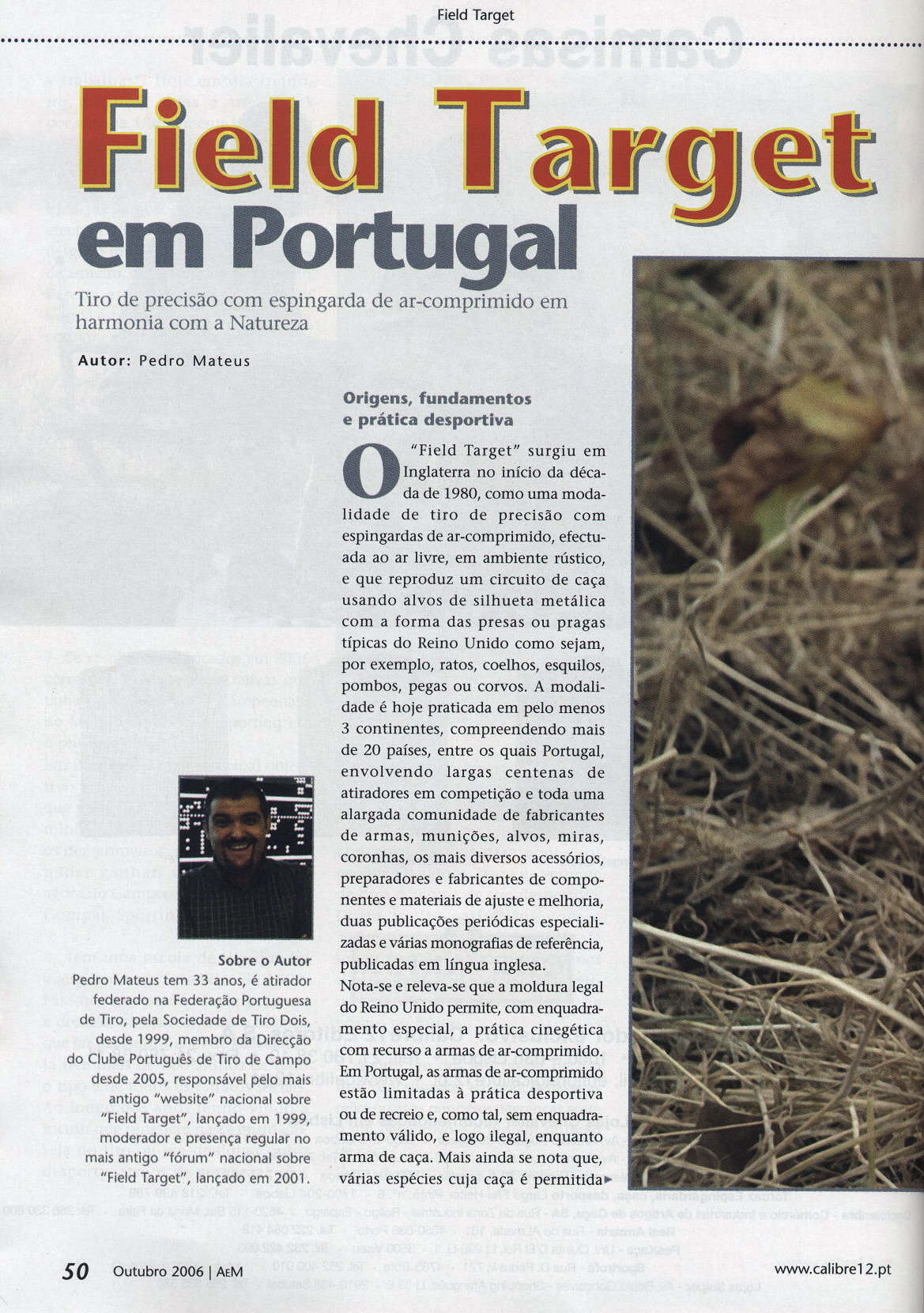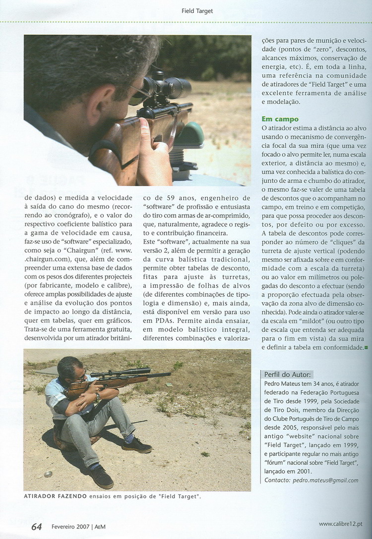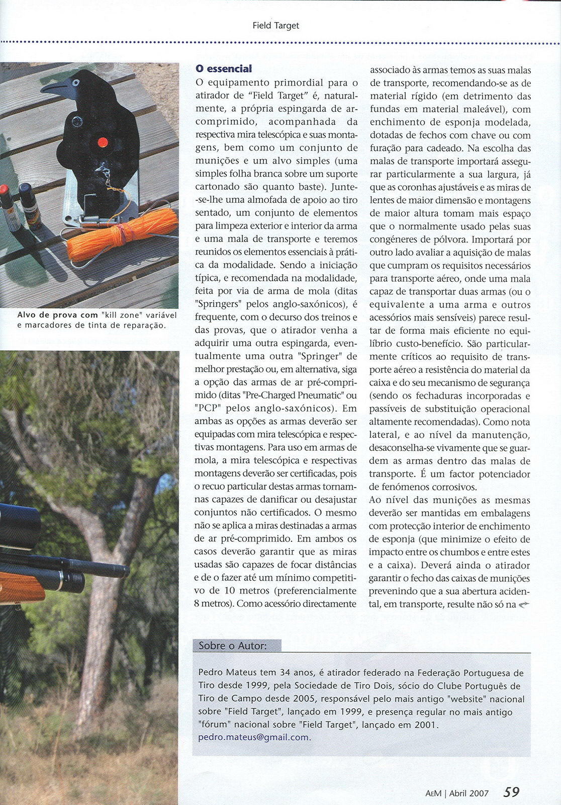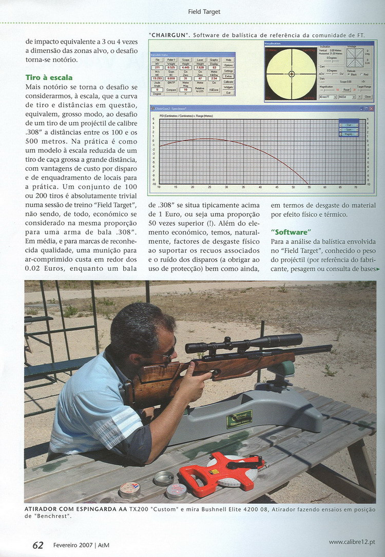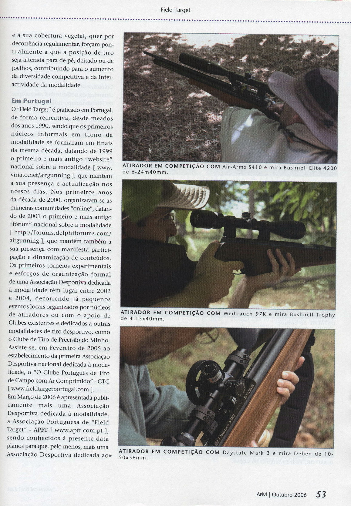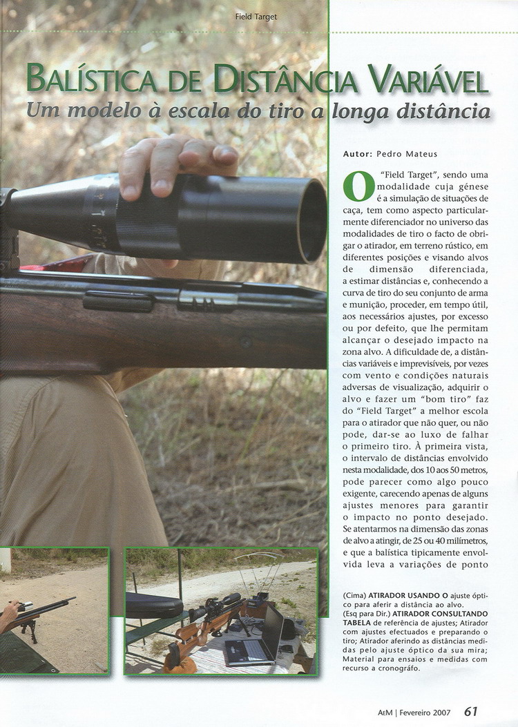 Artigo publicado sobre "Air-Arms EV2 MK.II" na Revista Armas & Munições de Janeiro/Fevereiro de 2008, pág.as 22 a 27. ![]() ![]() ![]() ![]() ![]() ![]() Em formato PDF, aprox. 3.7 MB >> Artigo publicado sobre "Campeonato do Mundo de Field Target 2007" na Revista Armas & Munições de Novembro/Dezembro de 2007, pág.as 10 e 11. ![]() ![]() Em formato PDF, aprox. 1.1 MB >> Artigo publicado sobre "Pistola AC Feinwerkbau (FWB) P 103" na Revista Armas & Munições de Setembro/Outubro de 2007, pág.as 18 a 21. ![]() ![]() ![]() ![]() Em formato PDF, aprox. 2.1 MB >> Artigo publicado sobre "Espingardas de Ar-Comprimido ao Ar-Livre; Modelos, o seu uso, a sua tecnologia e a sua história" na Revista Armas & Munições de Julho/Agosto de 2007, pág.as 62 a 65. ![]() ![]() ![]() ![]() Em formato PDF, aprox. 1.8 MB >> Artigo publicado sobre "Equipamentos e Acessórios de Field Target" na Revista Armas & Munições de Março/Abril de 2007, pág.as 58 a 62. ![]() ![]() ![]() ![]() ![]() Em formato PDF, aprox. 2.7 MB >> Artigo publicado sobre "Balística de Field Target" na Revista Armas & Munições de Janeiro/Fevereiro de 2007, pág.as 60, 61, 62 e 64. ![]() ![]() ![]() ![]() Em formato PDF, aprox. 1.2 MB >> Artigo publicado sobre "Alvos de Field Target" na Revista Armas & Munições de Novembro/Dezembro de 2006, pág.as 54 a 56. ![]() ![]() ![]() Em formato PDF, aprox. 940 KB >> Artigo publicado sobre o "Field Target e Associações Desportivas de FT", na Revista Armas & Munições de Outubro de 2006, pág.as 50 a 55. ![]() ![]() ![]() ![]() ![]() ![]() Em formato PDF, aprox. 4.5 MB >>