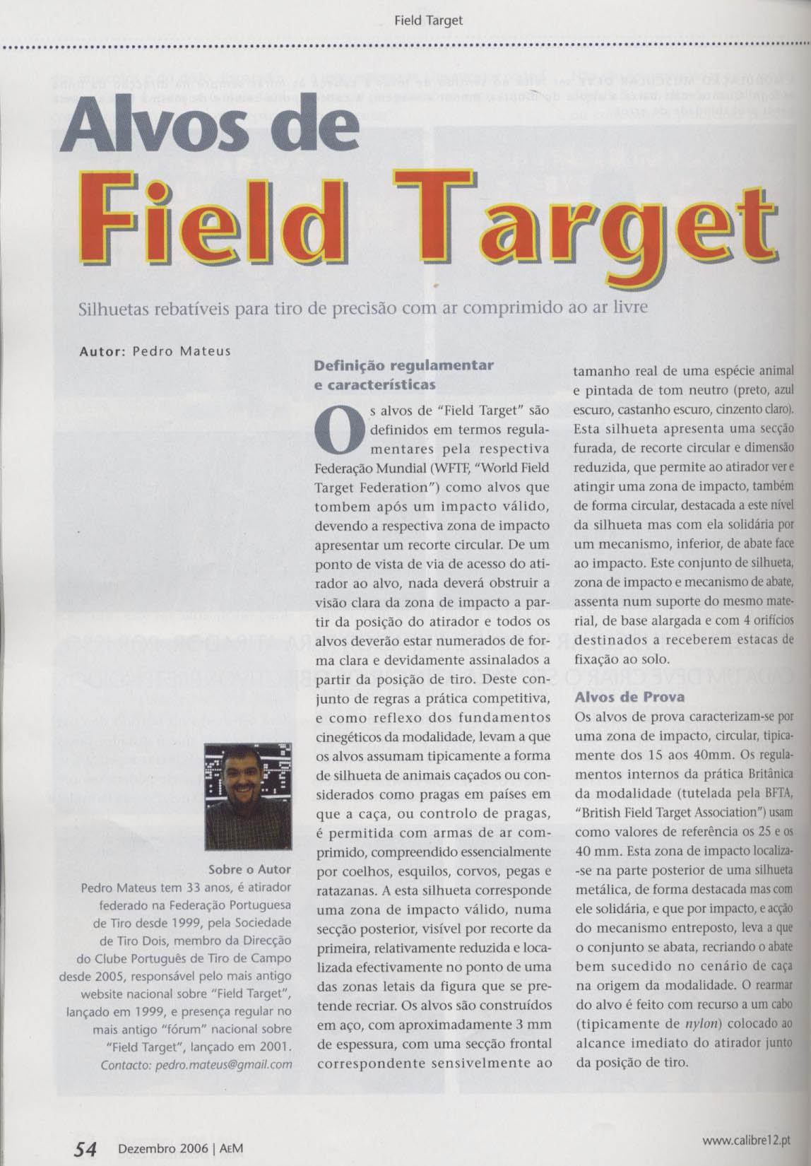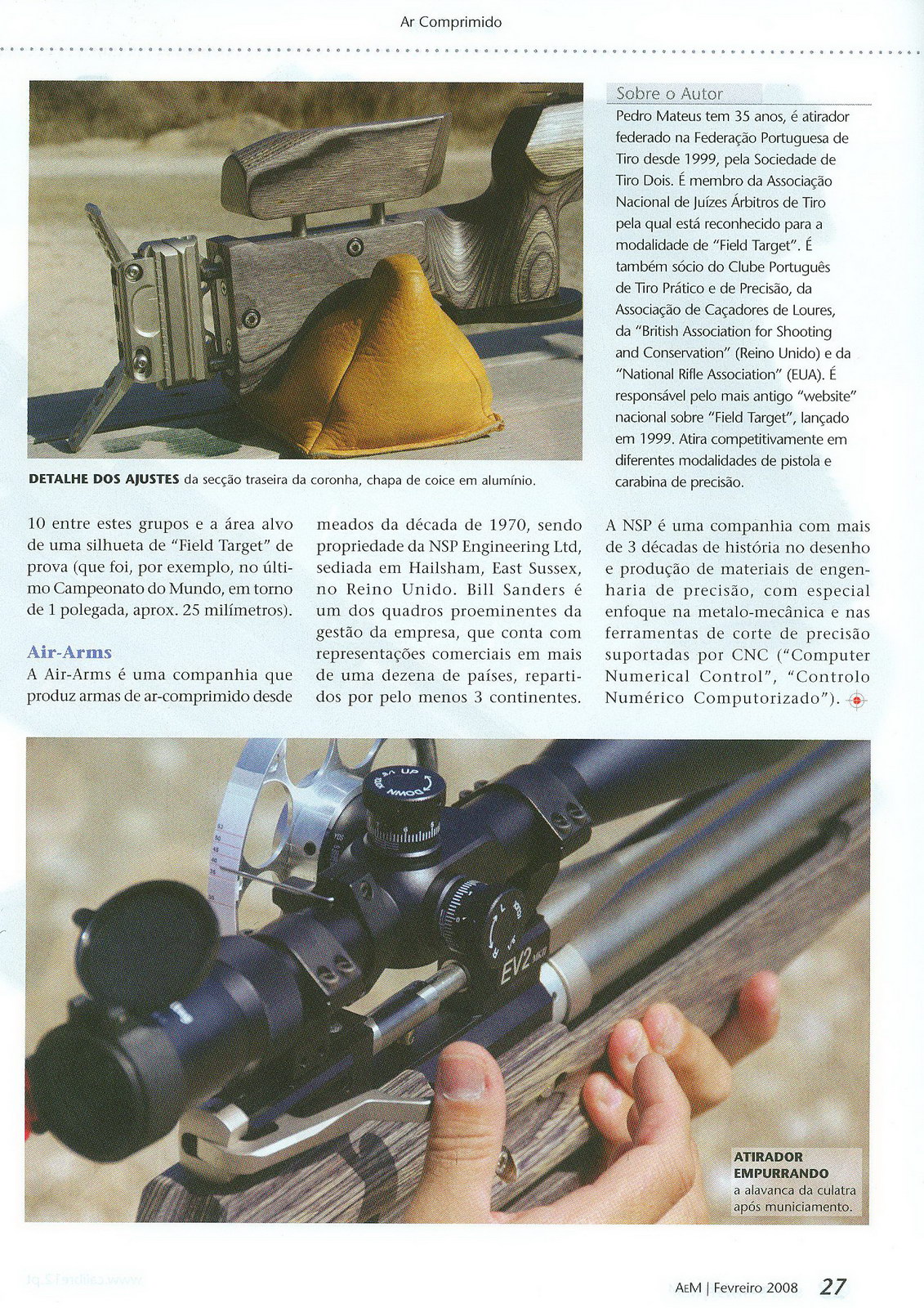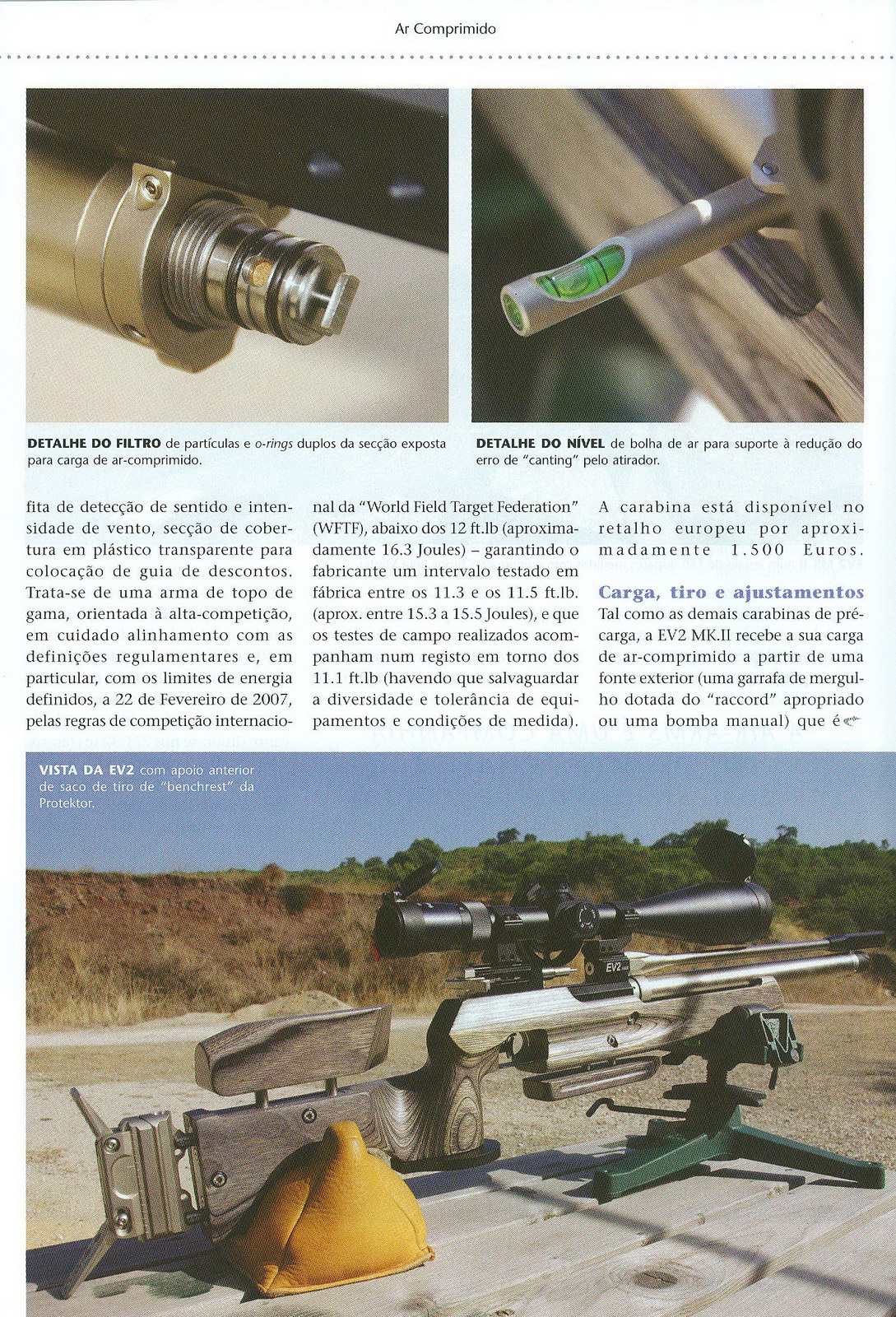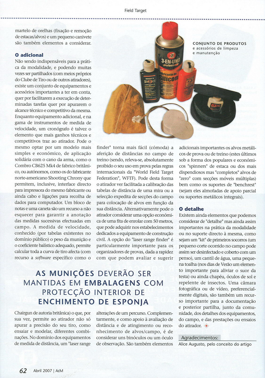 Artigo publicado sobre "Air-Arms EV2 MK.II" na Revista Armas & Munições de Janeiro/Fevereiro de 2008, pág.as 22 a 27. ![]() ![]() ![]() ![]() ![]() ![]() Em formato PDF, aprox. 3.7 MB >> Artigo publicado sobre "Campeonato do Mundo de Field Target 2007" na Revista Armas & Munições de Novembro/Dezembro de 2007, pág.as 10 e 11. ![]() ![]() Em formato PDF, aprox. 1.1 MB >> Artigo publicado sobre "Pistola AC Feinwerkbau (FWB) P 103" na Revista Armas & Munições de Setembro/Outubro de 2007, pág.as 18 a 21. ![]() ![]() ![]() ![]() Em formato PDF, aprox. 2.1 MB >> Artigo publicado sobre "Espingardas de Ar-Comprimido ao Ar-Livre; Modelos, o seu uso, a sua tecnologia e a sua história" na Revista Armas & Munições de Julho/Agosto de 2007, pág.as 62 a 65. ![]() ![]() ![]() ![]() Em formato PDF, aprox. 1.8 MB >> Artigo publicado sobre "Equipamentos e Acessórios de Field Target" na Revista Armas & Munições de Março/Abril de 2007, pág.as 58 a 62. ![]() ![]() ![]() ![]() ![]() Em formato PDF, aprox. 2.7 MB >> Artigo publicado sobre "Balística de Field Target" na Revista Armas & Munições de Janeiro/Fevereiro de 2007, pág.as 60, 61, 62 e 64. ![]() ![]() ![]() ![]() Em formato PDF, aprox. 1.2 MB >> Artigo publicado sobre "Alvos de Field Target" na Revista Armas & Munições de Novembro/Dezembro de 2006, pág.as 54 a 56. ![]() ![]() ![]() Em formato PDF, aprox. 940 KB >> Artigo publicado sobre o "Field Target e Associações Desportivas de FT", na Revista Armas & Munições de Outubro de 2006, pág.as 50 a 55. ![]() ![]() ![]() ![]() ![]() ![]() Em formato PDF, aprox. 4.5 MB >>