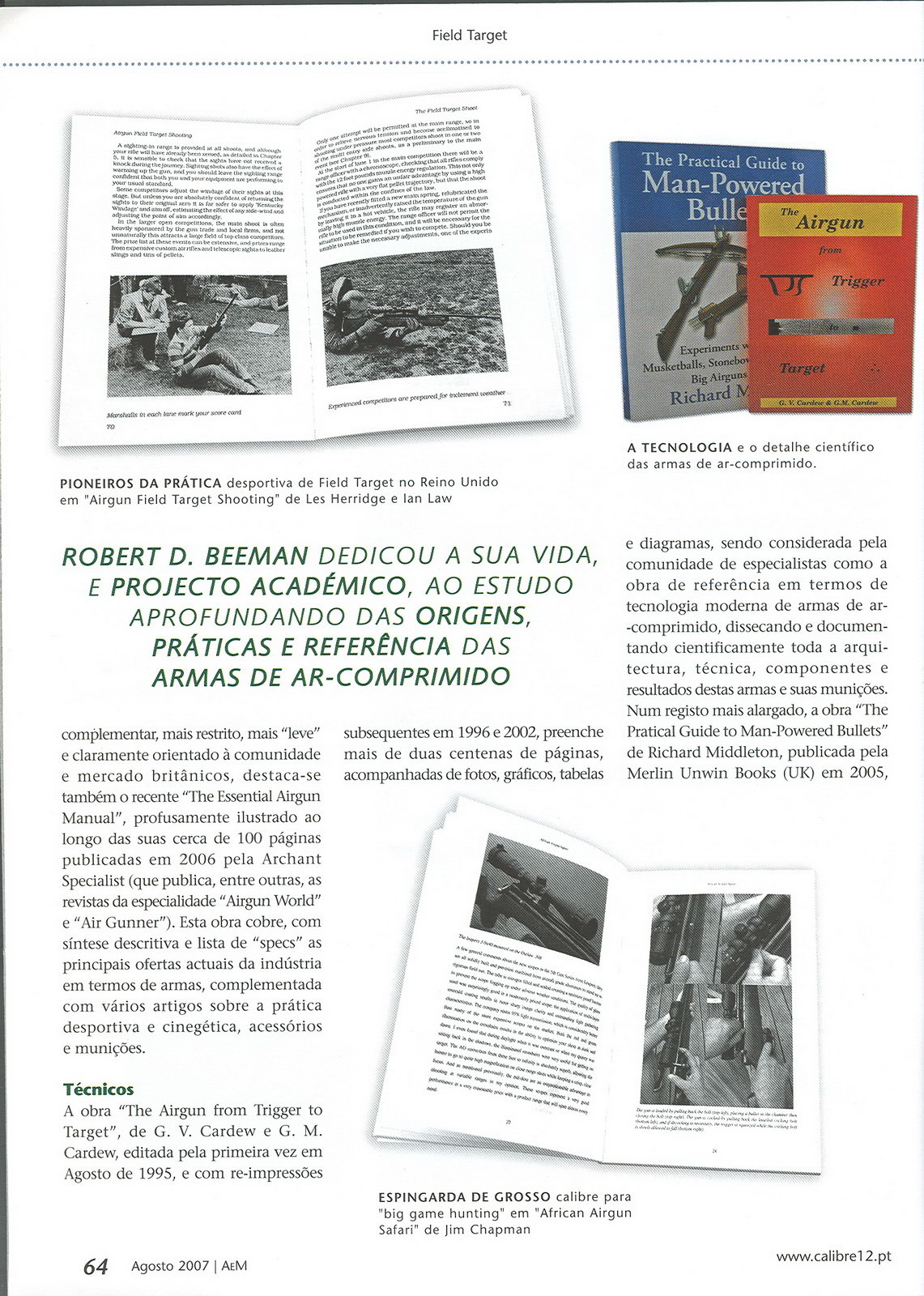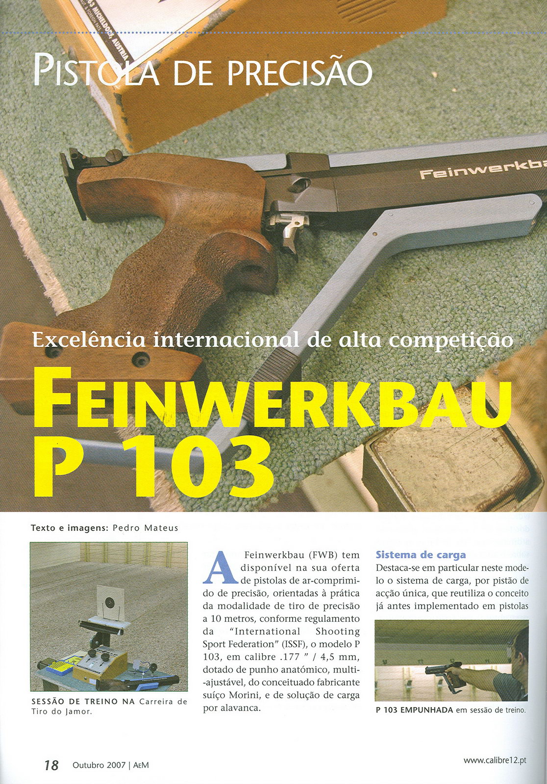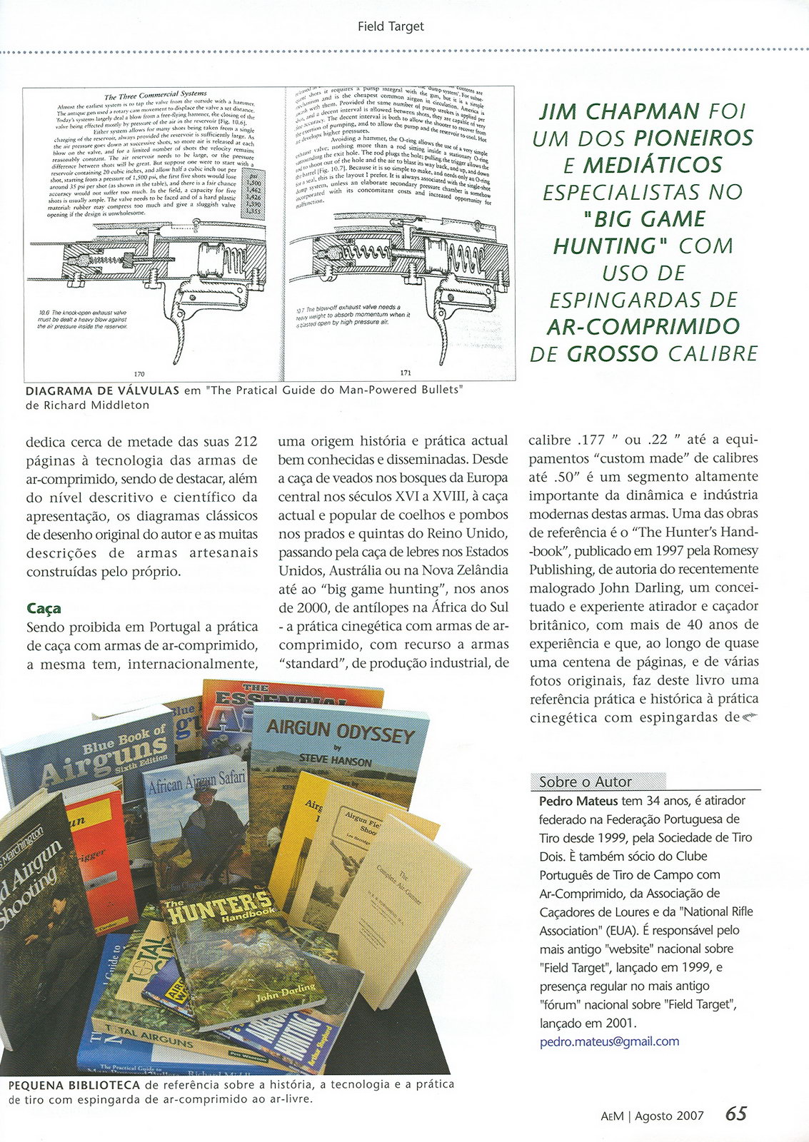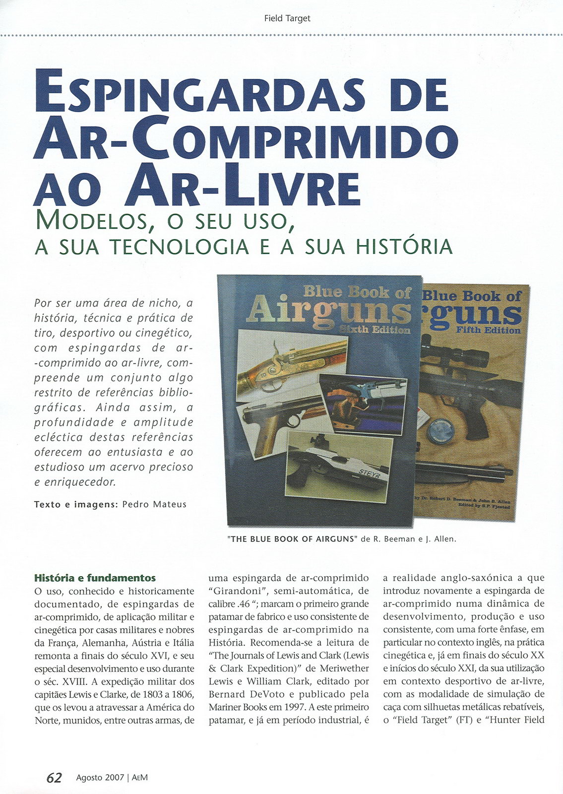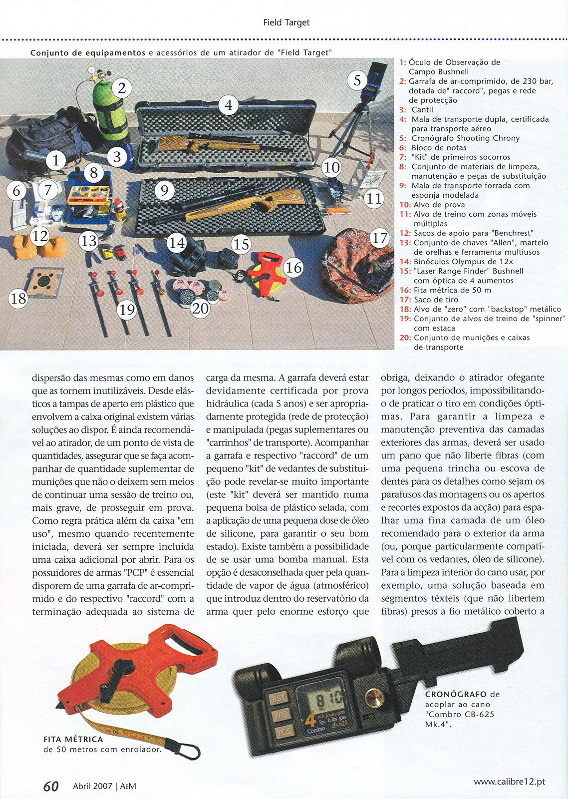 Artigo publicado sobre "Air-Arms EV2 MK.II" na Revista Armas & Munições de Janeiro/Fevereiro de 2008, pág.as 22 a 27. ![]() ![]() ![]() ![]() ![]() ![]() Em formato PDF, aprox. 3.7 MB >> Artigo publicado sobre "Campeonato do Mundo de Field Target 2007" na Revista Armas & Munições de Novembro/Dezembro de 2007, pág.as 10 e 11. ![]() ![]() Em formato PDF, aprox. 1.1 MB >> Artigo publicado sobre "Pistola AC Feinwerkbau (FWB) P 103" na Revista Armas & Munições de Setembro/Outubro de 2007, pág.as 18 a 21. ![]() ![]() ![]() ![]() Em formato PDF, aprox. 2.1 MB >> Artigo publicado sobre "Espingardas de Ar-Comprimido ao Ar-Livre; Modelos, o seu uso, a sua tecnologia e a sua história" na Revista Armas & Munições de Julho/Agosto de 2007, pág.as 62 a 65. ![]() ![]() ![]() ![]() Em formato PDF, aprox. 1.8 MB >> Artigo publicado sobre "Equipamentos e Acessórios de Field Target" na Revista Armas & Munições de Março/Abril de 2007, pág.as 58 a 62. ![]() ![]() ![]() ![]() ![]() Em formato PDF, aprox. 2.7 MB >> Artigo publicado sobre "Balística de Field Target" na Revista Armas & Munições de Janeiro/Fevereiro de 2007, pág.as 60, 61, 62 e 64. ![]() ![]() ![]() ![]() Em formato PDF, aprox. 1.2 MB >> Artigo publicado sobre "Alvos de Field Target" na Revista Armas & Munições de Novembro/Dezembro de 2006, pág.as 54 a 56. ![]() ![]() ![]() Em formato PDF, aprox. 940 KB >> Artigo publicado sobre o "Field Target e Associações Desportivas de FT", na Revista Armas & Munições de Outubro de 2006, pág.as 50 a 55. ![]() ![]() ![]() ![]() ![]() ![]() Em formato PDF, aprox. 4.5 MB >>